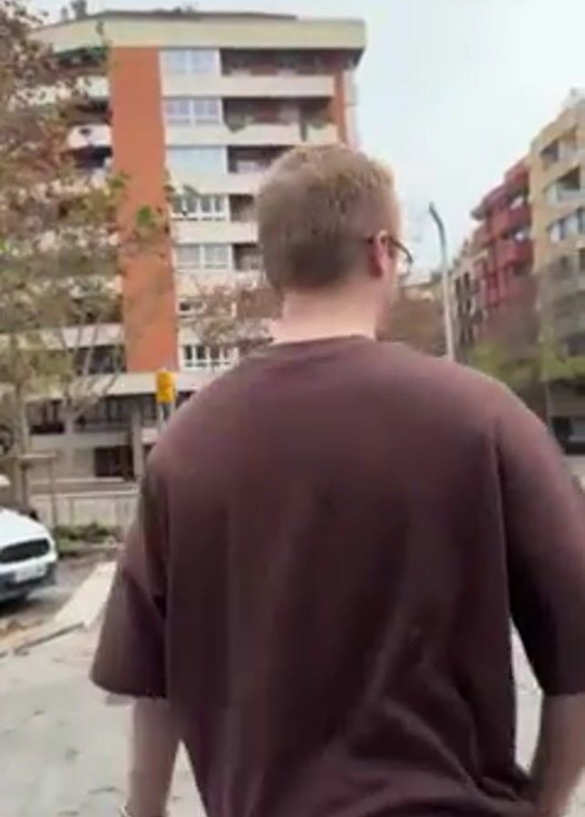 A fair-skinned, red-haired man wearing glasses and a brown, oversized t-shirt stands on a sidewalk next to a crosswalk, looking at the camera and smiling. He holds a rectangular object with red packaging. He turns to his right and walks across the crosswalk. The crosswalk is on a city street with several buildings on either side, and there are a few people visible in the background. The sky is overcast.