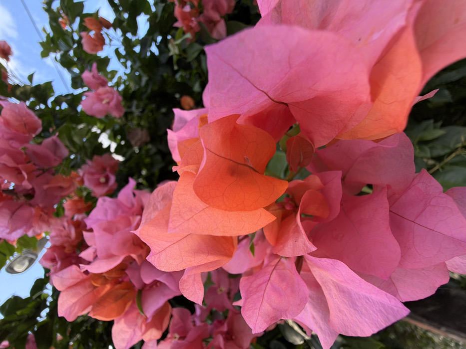 Close-up shot of pink and orange bougainvillea flowers cascading down. The petals exhibit delicate, translucent textures. Some flowers are clustered in the background, interspersed with green leaves. A glimpse of blue sky and a street light is visible in the bottom left corner. Sunlight illuminates the blooms, enhancing their vibrant colors and intricate details.
