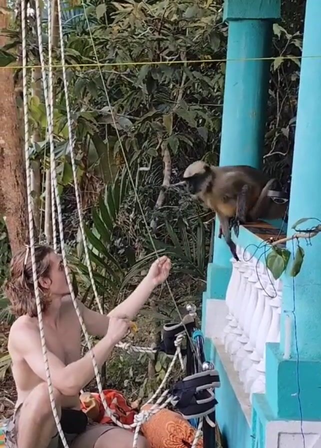 A man with long hair, shirtless and wearing shorts, sits among ropes and cushions. He is holding something in his hands and appears to be working on the ropes. To his right, a monkey sits on a turquoise and white balcony. The man holds out his hand to the monkey, which then takes something from him. The monkey sits and appears to eat the item. The background consists of lush green trees and foliage.