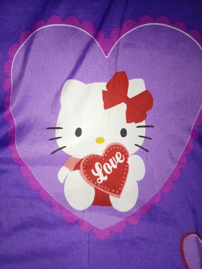 A close-up photograph depicts a graphic design on a purple textile, located in Umsobomvu Local Municipality, South Africa. The central subject is a white cartoon character, styled as Hello Kitty, with black eyes, a yellow oval nose, and three black whiskers on each side of its face. A red bow is positioned on the character's upper left ear. The character is depicted holding a red heart, which has a white scalloped border and the word "Love" written in white script across its center. The character and the heart it holds are contained within a larger, translucent purple heart shape, which is outlined by a scalloped magenta border. The background is a solid dark purple fabric, exhibiting minor wrinkles.