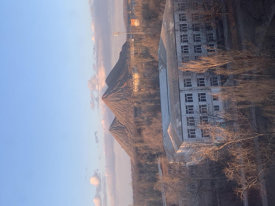 The image displays an elevated view of an urban landscape in Donetsk, Ukraine, specifically featuring the prominent "Three Terrikony" slag heaps in the background, consistent with the Proletarskyi district. The scene is illuminated by golden hour lighting, suggesting late afternoon or early evening. In the foreground and midground, a large, two-to-three-story building with a light-colored (likely white or light grey) facade and numerous rectangular windows is visible. The building has a dark, corrugated roof. Deciduous trees, predominantly bare of leaves, indicating late autumn or winter, are scattered around and in front of the building. Sunlight casts warm tones on the tree branches and parts of the building. In the background, three distinct, conical slag heaps, characteristic of mining waste, rise prominently against the horizon. They appear reddish-brown and grey, with visible striations on their slopes. Further bare trees and a scattering of smaller urban buildings are situated between the foreground building and the slag heaps. To the right, a white cellular communication tower stands tall amidst the distant structures. The sky above is light blue with scattered white and pink-tinged cumulus clouds. No individuals or explicit actions are discernible.