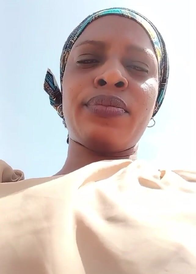 A woman is facing directly at the camera. She is wearing a patterned head wrap and a beige colored top. She has a serious expression. The background is light blue, suggesting it is outdoors with a clear sky.
