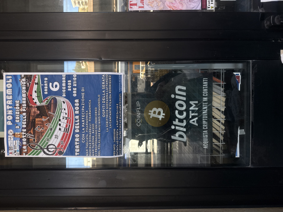 This image depicts a close-up, frontal view of a glass pane, likely a storefront window or door, in the city of La Spezia, Italy. Affixed to the upper section of the glass is a rectangular blue poster advertising "Pontremoli 3° Edizione La Notte della Fisarmonica" (The Night of the Accordion), scheduled for Saturday, December 6, 2025, at 9:00 PM at the Teatro della Rosa. The poster features a large treble clef stylized with red, white, and green Italian flag colors and musical notes, overlaid on a background image of a European townscape. Details include participating accordionists Max Tagliata and Daniele Donadelli, bassist Max Turone, and guest performers Giovanna Lattanzio and Vilaida Rodriguez, presenting Emilian/Romagnolo folklore. Entry is by offer starting from €5.00. Centered on the lower half of the glass is a "Coinflip Bitcoin ATM" advertisement, featuring a prominent yellow Bitcoin 'B' logo on a dark background. Text states "ACQUISTA CRIPTOVALUTE IN CONTANTI" (Buy cryptocurrencies with cash). Both the poster and the Bitcoin ATM advertisement show minor creasing and wear. The glass pane reflects elements of the surrounding environment, including an indistinct partial reflection of the photographer and lighter areas indicative of sky or distant buildings. Behind the glass, visible below the Bitcoin ATM sign, are dark, stacked items, possibly magazines or books. To the right, another partial poster with light pink graphics and "Teatro" text is faintly visible through the glass. The glass is framed by dark, vertical mullions or door frames. The scene is illuminated by ambient daylight.