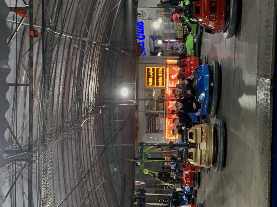 Several bumper cars, occupied by people, line up in an indoor amusement area. The cars are various colors including red, green, blue, and gold. A complex metal structure forms the ceiling of the enclosure. Background signage in Arabic and English indicates "50% sale" and names a business, partially obscured. The scene is illuminated by artificial lighting.
