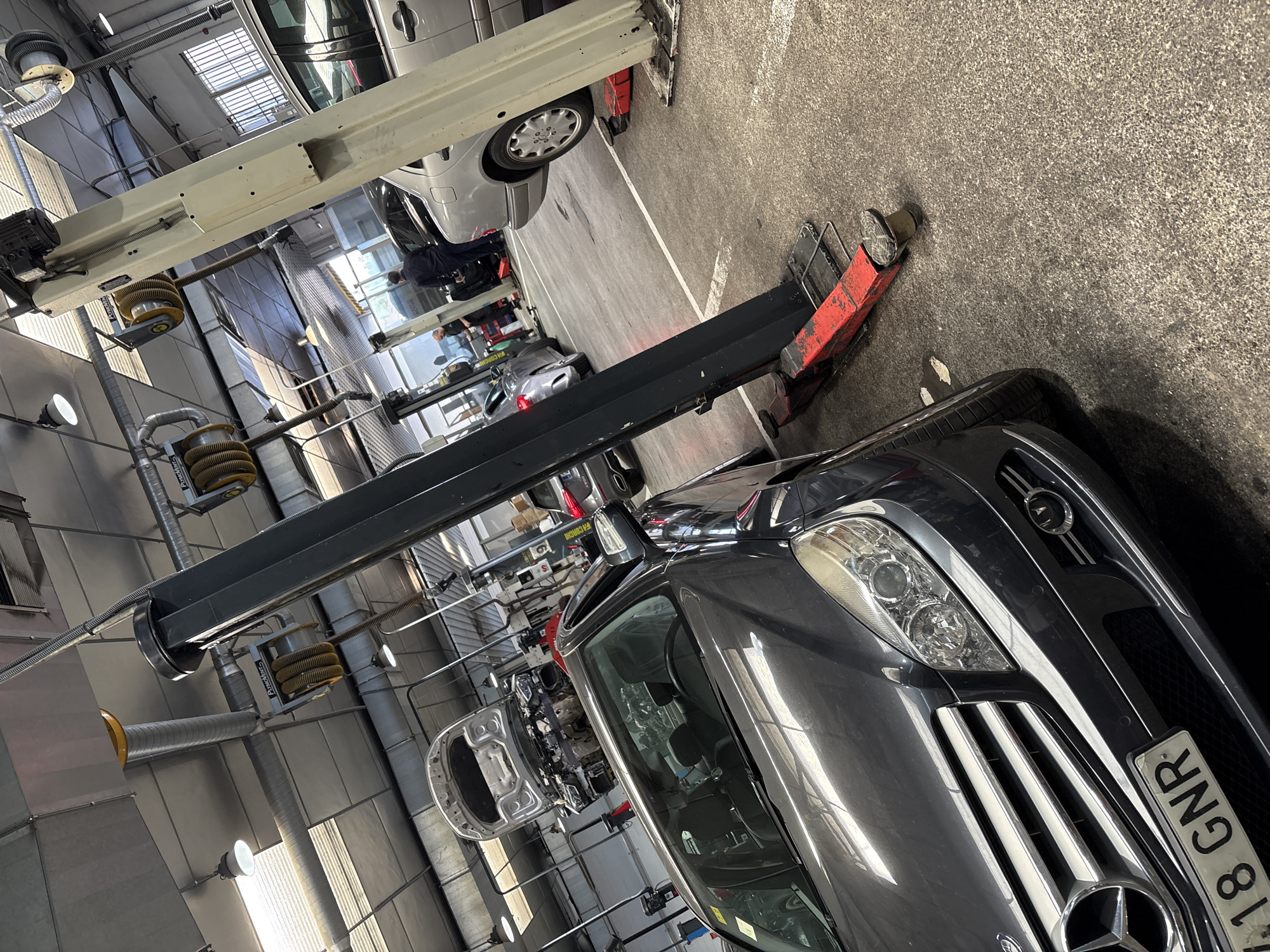 This image depicts an active indoor automotive repair facility located in Seville, Spain. The scene is dominated by multiple vehicles and industrial equipment. In the immediate foreground, the front of a dark grey Mercedes-Benz C-Class (W204) sedan, bearing Spanish license plate "418 GNR," is visible, positioned to the left of a black two-post car lift with a red base. Further into the facility, a silver vehicle, possibly a small SUV or hatchback, is elevated on another two-post lift, with its hood open and front bumper assembly removed, exposing engine components. To the right of this elevated vehicle, a silver Mercedes-Benz E-Class (W210) sedan is parked. Two individuals, consistent with mechanics, are present in the mid-ground. One person, dressed in dark clothing, stands near the rear of a dark vehicle, appearing to be engaged in maintenance. A second individual, wearing lighter work attire, is visible further left, near a tool cart. The environment features a high ceiling with exposed metal ductwork, overhead fluorescent lighting fixtures, and several yellow Plymovent exhaust hose reels suspended from the ceiling. Large windows with security grates are visible on the far wall. The floor is a textured grey concrete or asphalt surface, marked with white lines delineating work bays. Additional vehicles, including a dark SUV, are partially visible in the background.