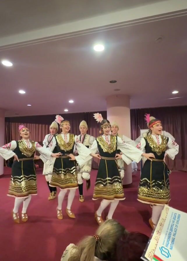 - "A group of seven folk dancers are performing a line dance in a brightly lit room with a red carpet" by FM-5RNFD2, licensed under CC BY 4.0