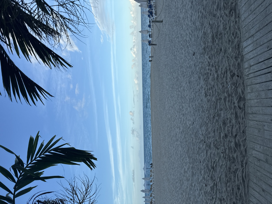 A beach scene with a blue sky and scattered clouds is captured alongside lush green palm leaves framing the left. The clear blue ocean meets a sandy beach lined with white umbrellas and chairs. A wooden boardwalk runs along the right side of the frame, contrasting with the natural beach setting. The overall atmosphere is tranquil and inviting.
