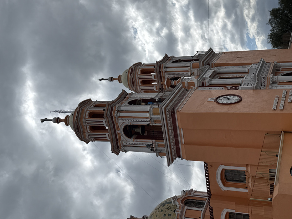 The photograph features a tall, ornate church under a sky filled with heavy, grey clouds. The church is adorned with bell towers, each topped with a white dome and a cross. A clock is visible on the side of the church, and a sign with illegible text is mounted beside it. The church's color scheme is a mix of orange and white, with elaborate architectural details.