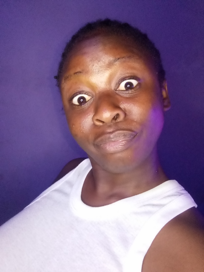 A close-up, chest-up image depicts an individual, an adult female with a dark complexion, located in the city of Akwanga, Nigeria