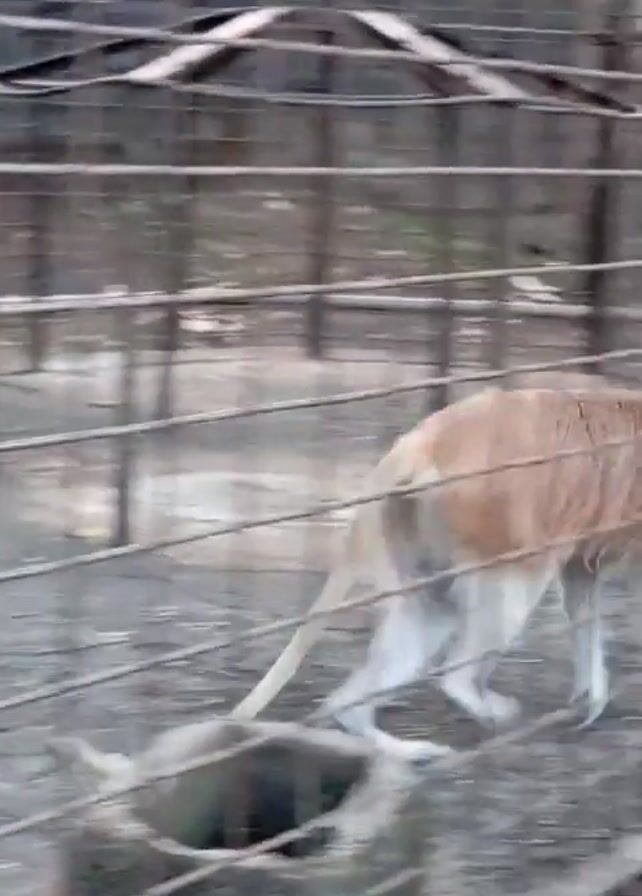 A pale reddish-brown monkey with a long tail walks left behind a tall metal cage in an outdoor enclosure