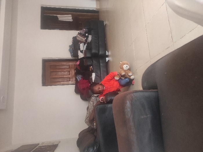 This image depicts an indoor scene within a residence in Gura Top, Nigeria, likely a living room. The perspective is low, looking towards the center and rear of the room. The foreground is occupied by the dark brown armrest of an armchair or sofa. In the mid-ground, a young child, appearing to be a toddler, is situated low to the ground, wearing a red long-sleeved top, blue pants, and pink footwear. The child's left hand is placed on the dark armrest of a sofa, seemingly supporting itself. To the child's right, a light brown teddy bear lies on its side on the tiled floor. Further into the background, a person is partially visible, lying or resting on a dark-colored sofa on the left, covered from the waist down with a patterned fabric. To the right of this, two more dark-colored sofas are visible, heavily covered with an assortment of folded or piled clothing items, including red, white, and darker fabrics. The room features light-colored, possibly white, walls and a floor covered with light-toned square tiles. Two wooden doors are visible in the back wall: one closed, paneled, and dark brown on the left, and another slightly ajar on the right, revealing a dark interior and a white garment hanging inside. Two framed items are mounted on the left wall above the sofa. The ceiling features a recessed light fixture.