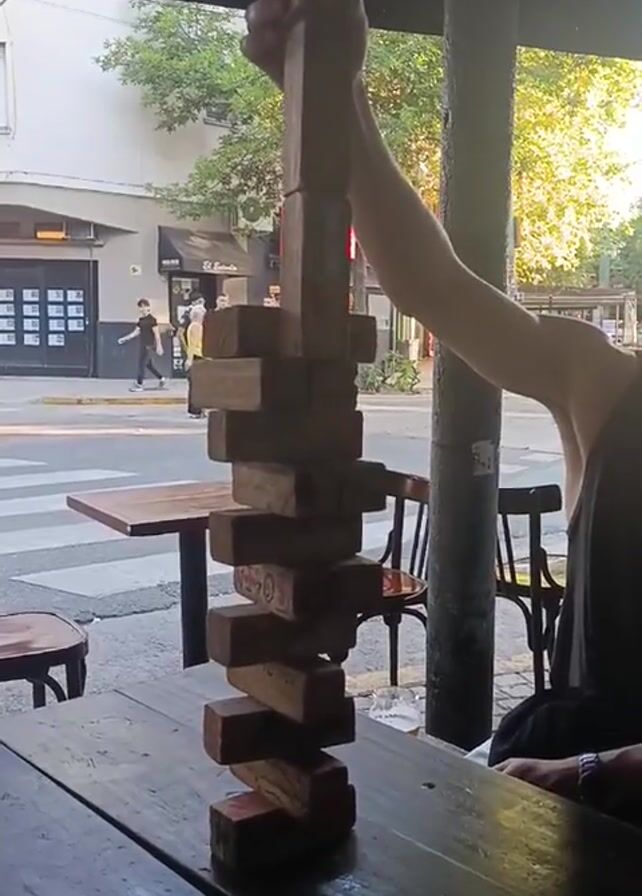 person playing Jenga at an outdoor table. The Jenga tower is tall, with several blocks sticking out. The person is holding the top of the tower steady. The table is made of dark wood, and there are chairs around it. In the background, there is a street with buildings and trees. People can be seen walking on the sidewalk. It is daytime, and the sun is shining.