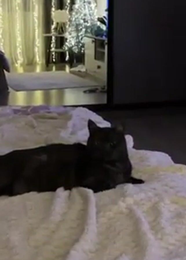 A dark cat lies on a soft, textured cream-colored blanket. A remote control sits near the bottom left of the frame. In the background is a sliding door, reflecting a Christmas tree decorated with lights and other festive decorations. The camera zooms in on the cat's face.