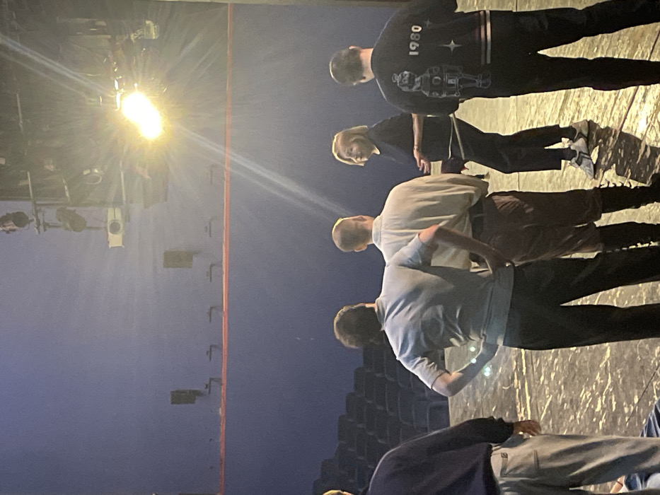 The image displays an indoor scene on what appears to be a theater stage, with an empty auditorium visible to the left. Five individuals are present on the stage, illuminated by bright stage lighting, including a prominent light source from the upper right creating lens flare. On the far left, a male is partially visible, wearing a dark top and light pants. Next to him, a male with dark hair is seen from behind, wearing a light grey short-sleeved top and dark pants, with his hands on his hips. To his right, another male, with short light hair, wears an off-white long-sleeved shirt, dark brown breeches, and tall dark boots. Positioned center-right, a female with short light brown hair is seen facing left, looking at the two men beside her. She is wearing a dark top, dark pants, and white-soled sneakers, with her hands in a gestural pose, indicative of speaking or explaining. On the far right, a male, viewed from behind, wears a dark long-sleeved shirt featuring a white graphic of an astronaut or robot and the text "1980," paired with dark pants. The stage floor shows surface wear and reflective areas. In the background, rows of dark, empty theater seats recede towards a blue-grey wall. This wall features a horizontal red line or rail with small fixtures, and several dark rectangular speakers or monitors mounted above it. Overhead, stage trussing, various lighting fixtures, and a projector are suspended. The precise location within the city of Moscow, Russia, cannot be determined from the visual information provided in the image.
