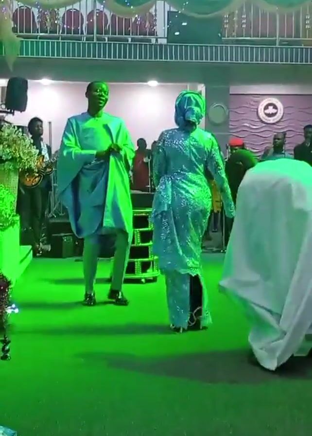 Here's a concise description of the video: A man and a woman, both dressed in light blue traditional Nigerian attire, are dancing on a brightly lit stage. The man is wearing a loose tunic and trousers, while the woman has a long, fitted lace dress with a headwrap. The stage is covered in a carpet that changes color, cycling through green, blue, and purple. Behind them, a band with a guitarist is playing. To the side, a person in white clothing is bowing. The setting appears to be a church or event hall.