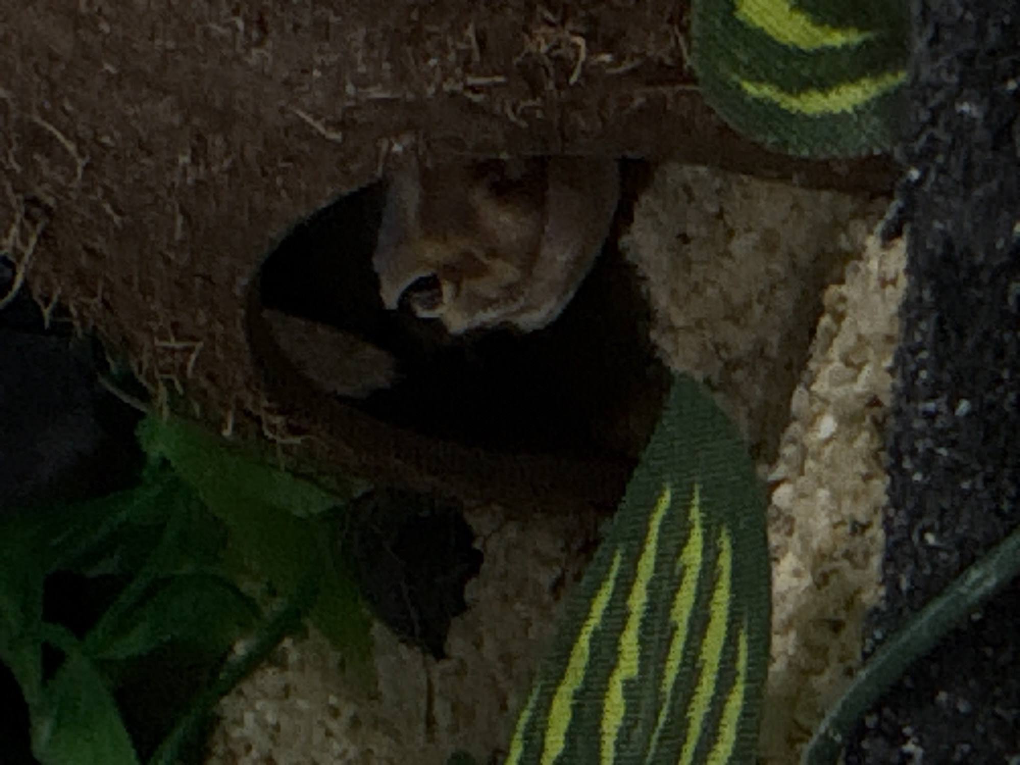 - "A light-colored reptile, identified as a lizard, is partially visible peeking from a dark, circular opening of a brown, textured artificial hide" by FM-Di3hr2, licensed under CC BY 4.0