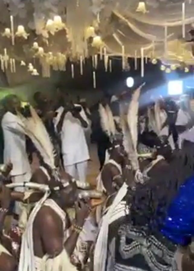 A large group of people are assembled in a decorated hall, participating in what appears to be a cultural performance or celebration. In the foreground, numerous individuals, primarily men, are seated or squatting, wearing distinctive traditional attire including black and white patterned cloths, headbands, and feather-like accessories. Some are clapping or playing musical instruments, possibly horns or pipes. A woman wearing a blue and silver dress, with a basket on her head, is dancing amidst the seated group. In the background, other men dressed in white traditional attire are also participating, some dancing and others observing. The hall is decorated with white drapery and hanging floral arrangements with lights, creating a festive atmosphere. There are also numerous observers standing or moving around in the background, some recording the event with their phones.