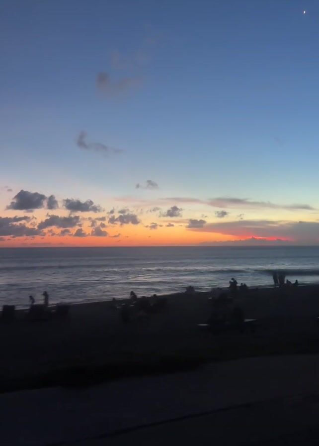 view from a moving vehicle, likely a car, looking out at a beach at sunset. The sky is a gradient of blues and oranges. The ocean is visible and has waves. The beach is dark and silhouetted, with people standing and walking along the shore. The vehicle is moving, causing the view to be somewhat blurry. A person walks briefly in front of the vehicle at one point. The moon is visible in the sky.