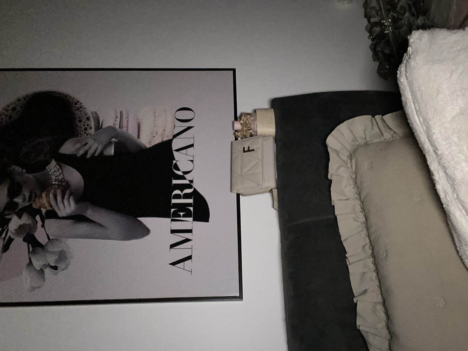 A framed print of a woman eating a croissant under the word "Americano" hangs on a white wall. A cream-colored wallet with the letter "F" rests on top of a gray headboard. A cream-colored pillow with ruffled edges sits on the headboard, alongside a white blanket. The wall space is minimally decorated.