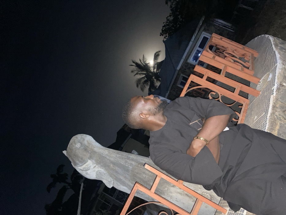 A man in dark clothing stands outdoors at night. He is looking towards the moon and a palm tree visible in the background. The scene includes a building, part of a fence with ornate design, and what appears to be a concrete or stone sculpture. The overall mood is peaceful and contemplative due to the night setting.