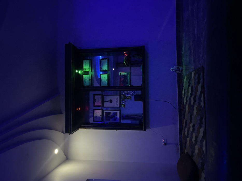 room with a high ceiling. A glass display case is filled with framed certificates and awards, illuminated by colorful lights. To the right, a patterned rug lies on the floor. The room is lit with a combination of cool blue and warm yellow light, creating a distinct ambiance. A single shoe is perched on the wall above the rug.