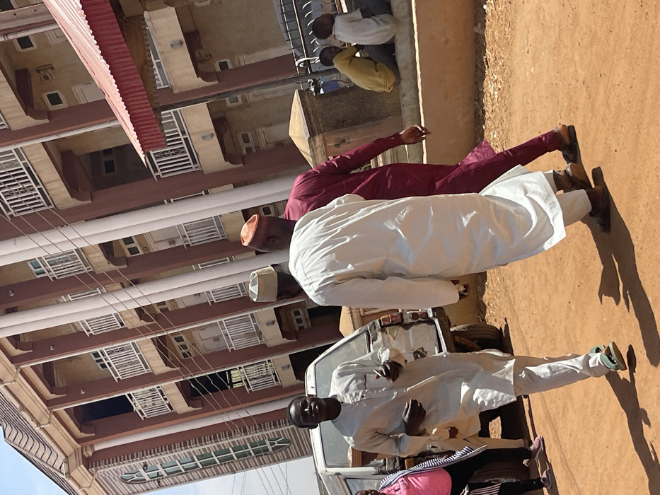 The image depicts an outdoor street scene in Chikaji, Nigeria, under bright daylight. In the foreground, a reddish-brown unpaved ground surface is visible. From left to right, a partially visible individual in a pink top and dark clothing with white stripes stands near the rear of a white utility vehicle, possibly a pick-up truck, which is positioned to the left of the frame. To the right of the vehicle, a young male dressed in a light-colored traditional Nigerian garment (tunic and trousers) and green sandals walks forward, looking slightly to his right, with his right hand slightly raised. Behind him, two men walk away from the viewer. The left man wears a white traditional garment and a light-colored cap; the right man wears a deep red traditional garment and a red cap. Both wear dark footwear. In the midground, to the right, a low, light-brown concrete wall or barrier extends horizontally. Two individuals, both appearing to be young males, are seated on this wall; one in a yellow top to the left, and one in a white top to the right. Behind them, a structure with a red corrugated metal roof is partially visible. The background is dominated by a multi-story building featuring a reddish-brown facade, multiple white vertical columns, and white metal balcony railings on each of its visible floors. Power lines are visible in front of this building. The sky is clear, and strong shadows indicate direct sunlight.