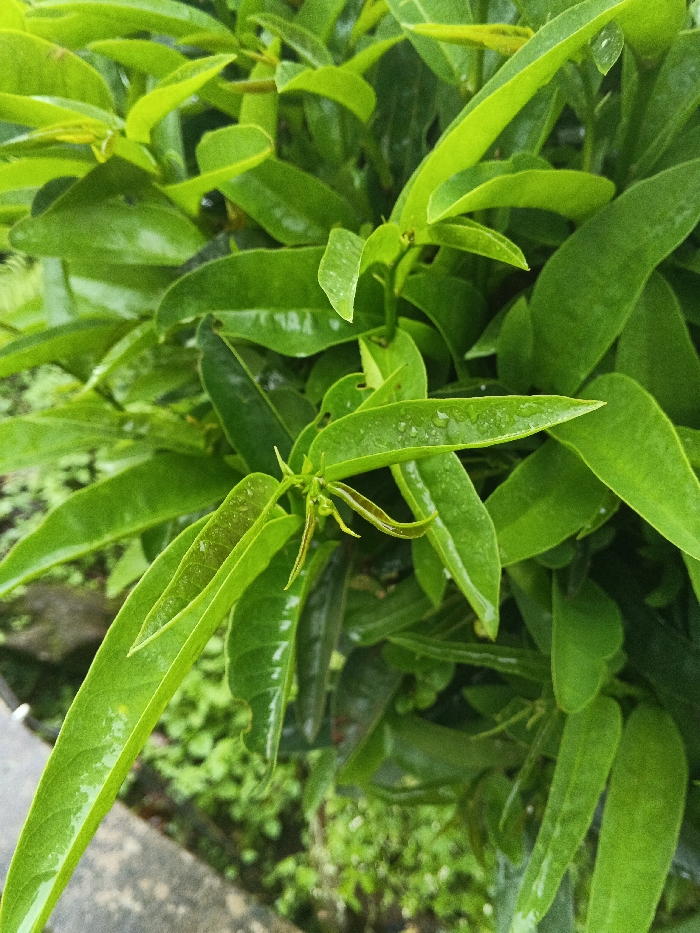 The image displays a close-up view of vibrant green foliage, identified as being located in Tapaiteng Uesa, Bhutan. The frame is dominated by numerous elongated, lanceolate leaves, many of which exhibit small, translucent water droplets on their surfaces. Several lighter green, nascent leaves and developing shoots are visible near the center of the plant structure. The background consists of out-of-focus green foliage and a blurred ground area featuring smaller green plants and a dark gray, possibly concrete or stone, edge in the lower left portion. There are no human figures, animals, or discernible actions/interactions depicted beyond the natural presence of the plant and its hydrated state.
