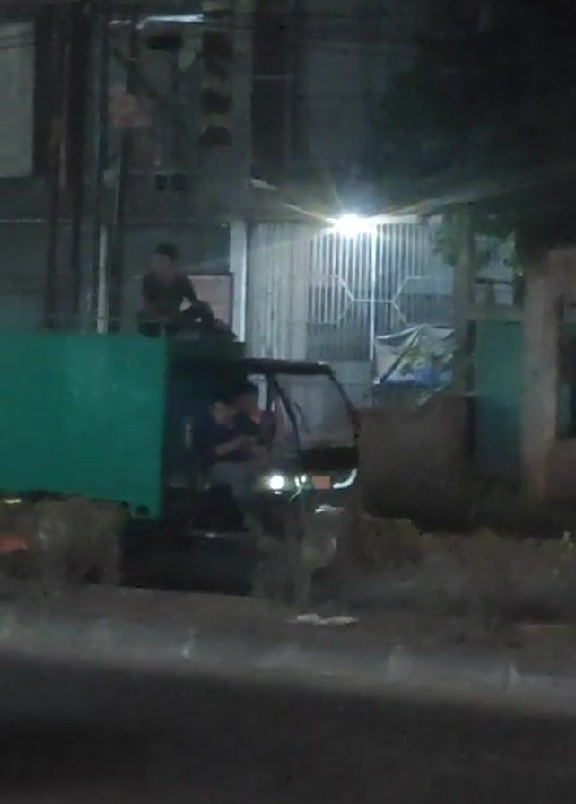 At night, a black three-wheeled vehicle with a green cargo box is parked on the side of a road. The vehicle has its headlights on. There are two people present. One person is standing on top of the green cargo box, while the other is sitting in the driver's seat of the vehicle. The surrounding environment includes buildings with dim lighting and trees. The street is dark and wet. Other vehicles are passing on the road.