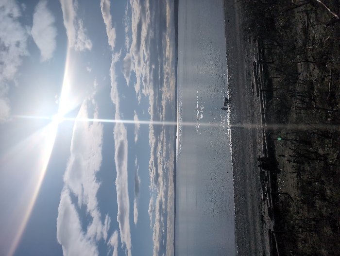 The image depicts a coastal scene in Shoreline, Washington, United States, likely overlooking Puget Sound. The upper portion of the frame is dominated by a bright sun, positioned in the upper right quadrant, producing a prominent lens flare with a strong vertical light streak and a horizontal rainbow-like arc. The sky is partially cloudy, featuring scattered white cumulus and stratocumulus clouds against a light blue background, transitioning to darker tones towards the horizon. A vast, calm body of water (Puget Sound) occupies the middle ground, reflecting the sun's glare as a sparkling path extending towards the viewer. Distant land or hills are visible as a dark band along the far horizon across the water. A narrow strip of dark-toned gravel or pebble beach separates the water from the immediate foreground. At the waterline on the beach, to the right of the sun's reflection, two dark, silhouetted figures are present; one appears to be standing, facing the water, next to a second, smaller, indistinct dark shape. The immediate foreground consists of an elevated, dark-toned bank covered with sparse, dry, or dormant vegetation, appearing as thin, dark stems and branches. Several dark, horizontal logs or pieces of driftwood are arrayed across this bank. Two additional dark, indistinct figures are discernible, seated on these logs. The entire scene is heavily backlit by the sun, resulting in the silhouetting of foreground and mid-ground elements.