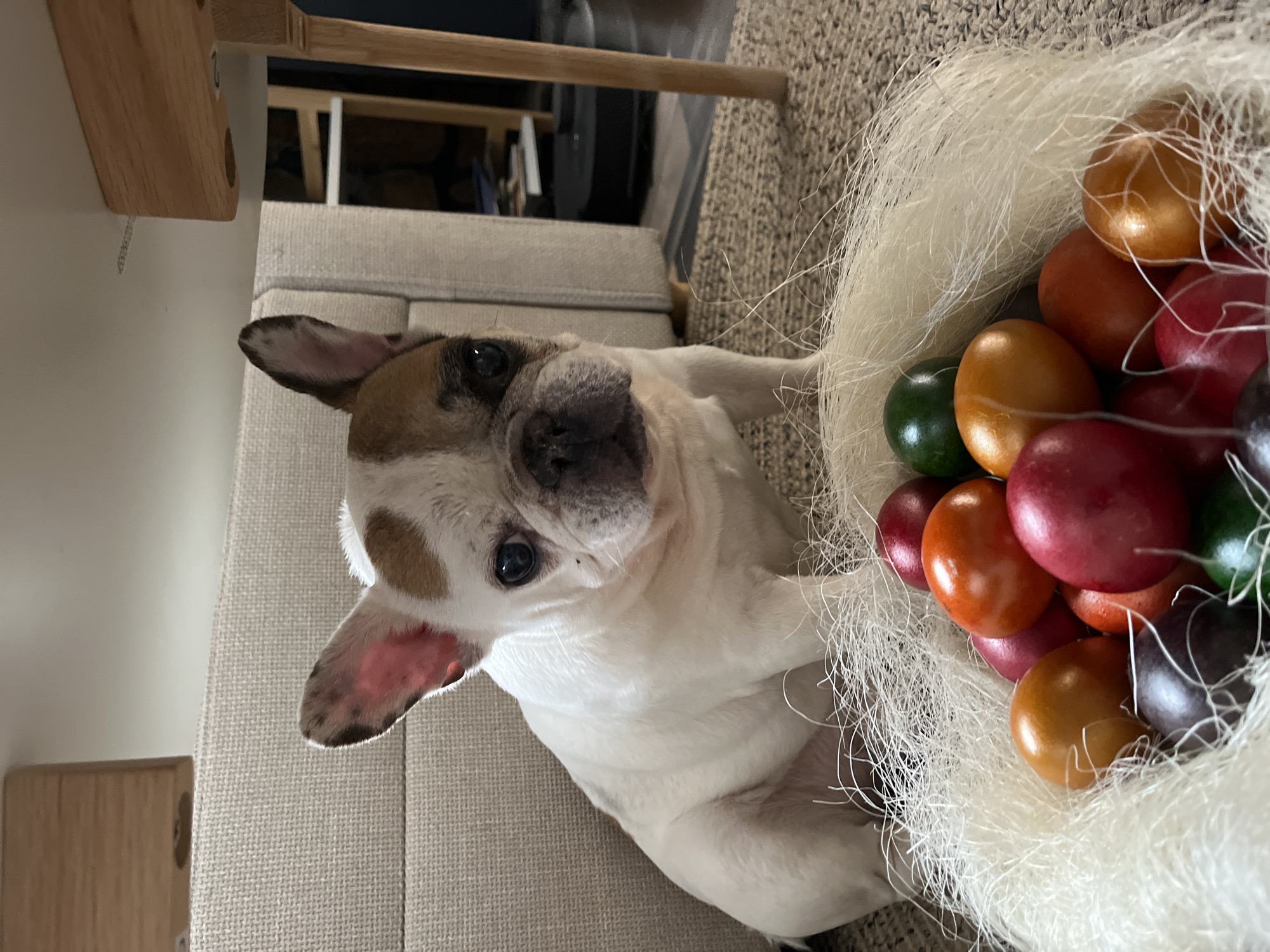 A white and tan French bulldog is lying on a beige upholstered surface, likely a sofa or chair, looking directly at the camera with a slightly tilted head. Next to the dog is a white nest filled with multicolored, shiny, rounded objects that appear to be candy or decorations. The background includes a wooden furniture leg and a patterned rug or carpet. The location in the city of Perushtitsa, Bulgaria cannot be determined from this image.