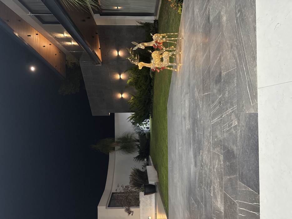 A dimly lit exterior shot displays a modern house at night. Illuminated reindeer decorations stand on a neatly cut lawn next to a grey stone pathway. Wall lights are visible, accentuating the home's contemporary design. The moon glows in the dark sky above the building. Potted plants and minimalist landscaping add to the scene's serene ambiance.