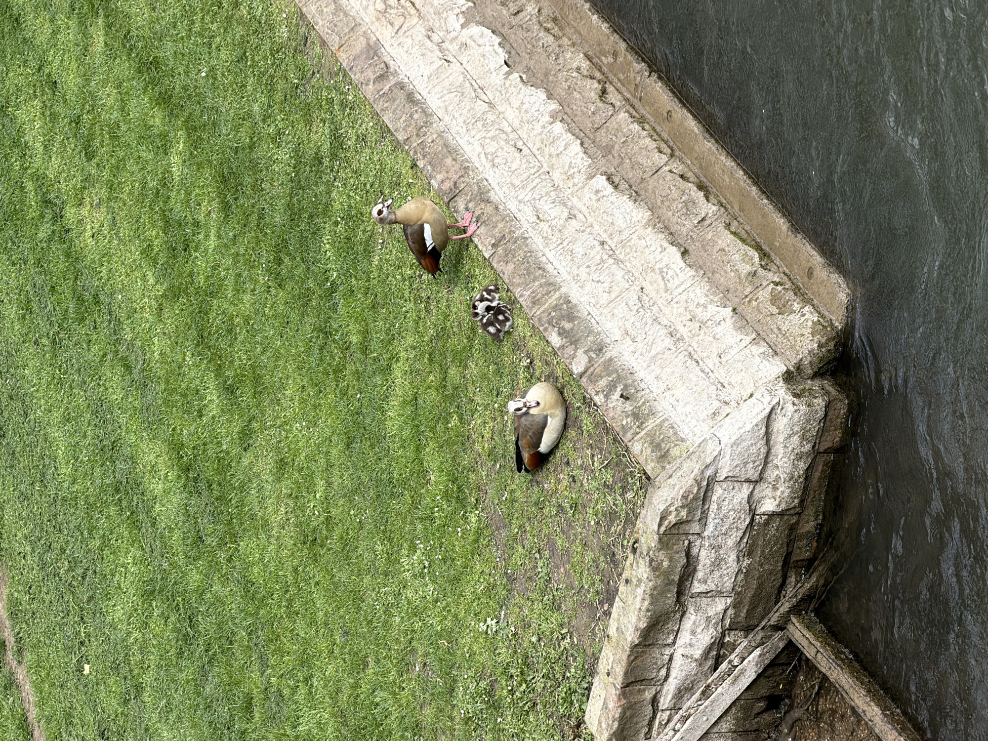 This overhead image depicts a family of Egyptian Geese (Alopochen aegyptiaca) situated on a grassy bank bordering a waterway in Strasbourg, France. The scene is characterized by a verdant green grassy slope in the upper portion, transitioning to bare earth and a sturdy stone retaining wall in the mid-ground. One adult Egyptian Goose is observed resting on a patch of bare earth at the base of the grassy slope, positioned to the left. To its right, a cluster of at least three, distinctively striped black and white goslings is huddled together on the dirt path immediately above the stone wall. A second adult Egyptian Goose stands upright on a narrow earthen ledge directly above the stone retaining wall, situated to the right of the goslings and facing towards them. The lower half of the image showcases the multi-tiered stone retaining wall, constructed from large, irregular grey and light-colored blocks, displaying visible signs of weathering and some organic growth. At the bottom left, a wooden structure, possibly a ramp or part of an old sluice, extends into the dark, rippling water of the canal or river. A narrow, lighter-colored ledge runs along the waterline beneath the main retaining wall on the right.