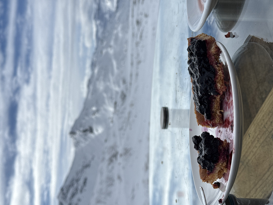 The scene depicts an outdoor setting in Saint-Martin-de-Belleville, France, with a prominent snow-covered alpine mountain range visible in the background under a partly cloudy sky. In the foreground, two partially consumed pieces of a pastry, likely a tart with a golden-brown crust and a dark, berry-based topping (consistent with blueberries or similar fruit), are centered on a round white ceramic plate. Reddish fruit juice stains are visible on the plate. A silver-colored utensil handle extends from the left edge of the plate. To the right of the plate, a small white saucer contains reddish liquid residue. Behind the plate, a clear glass bottle with a dark, possibly metallic, screw-top lid stands upright on a reflective surface, which appears to be a glass table. The table's surface shows reflections of the environment, and a wooden texture is discernible beneath it. No individuals are visible.