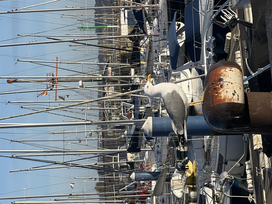 A white and grey seagull with a yellow beak, red spot on its lower mandible, and yellow legs stands on a rusty, brown metal bollard in the foreground. The seagull faces right, with its head slightly turned, observing the scene. Behind it, a blue mooring post marked with the number "1" is partially visible. The midground and background are dominated by a marina in the Port of A Coruña, Spain, featuring numerous sailboats and yachts docked in the water. Their masts and rigging form a dense, vertical network against a clear blue sky. Several boats are white, some with blue covers, and one boat has a yellow tender or buoy alongside it. In the distance, a shoreline with urban structures and green foliage is visible. A prominent tall mast, potentially from a larger ship or a fixed structure, displays a Spanish flag (red-yellow-red horizontal stripes) and has a platform with a small, indistinct figure on it. A green navigational marker is also visible on the far side of the marina. No other individuals are discernibly present. The environment suggests a sunny day in a maritime setting.