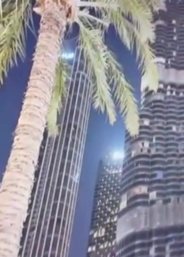 The camera points upwards at night, showcasing the Burj Khalifa skyscraper and a palm tree in the foreground