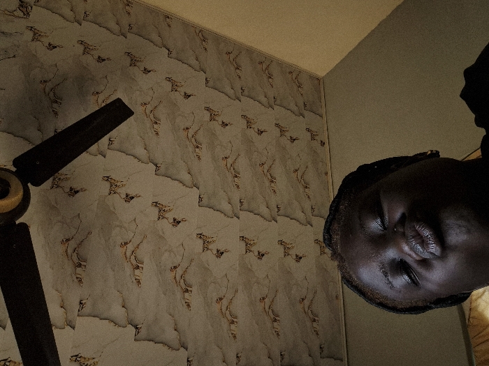 The scene shows an individual inside a building located in Yelwa, Nigeria. A person with dark skin and braided hair is visible in the lower portion of the frame, captured from a low-angle perspective. Their eyes are closed or squinted, and their lips are pursed into a "kissing" expression. A small metal nose ring is present on the left nostril. Above the individual, a ceiling covered with patterned wallpaper displays a repetitive design of light brown and beige abstract or organic shapes, suggestive of distressed material. A dark brown ceiling fan, with two blades partially visible, is mounted on the ceiling in the upper section of the image and appears inactive. A plain, light-colored wall is partially visible in the upper right background.