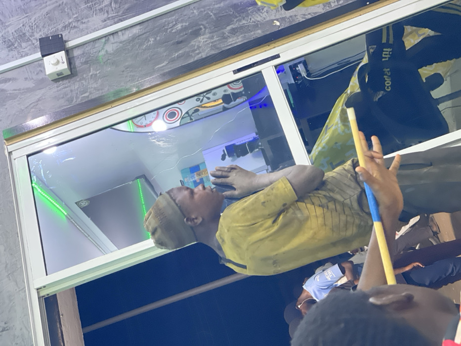 The image depicts an indoor scene in Unguwar Gabas, Nigeria, primarily focused on a young male individual standing near a glass door or window