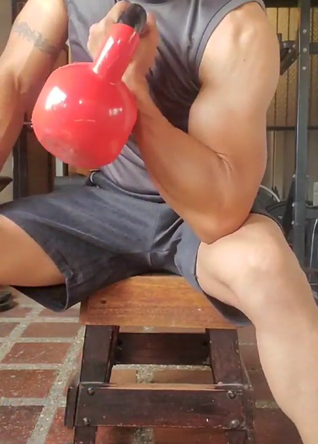 A man sitting on a small wooden stool is working out with a red kettlebell. He is wearing a gray tank top and gray shorts. He is curling the kettlebell with his right arm, while his left arm is resting on his leg. He has a tattoo on his left bicep. In the background is a weight rack and a tiled floor. The man is centered in the frame.