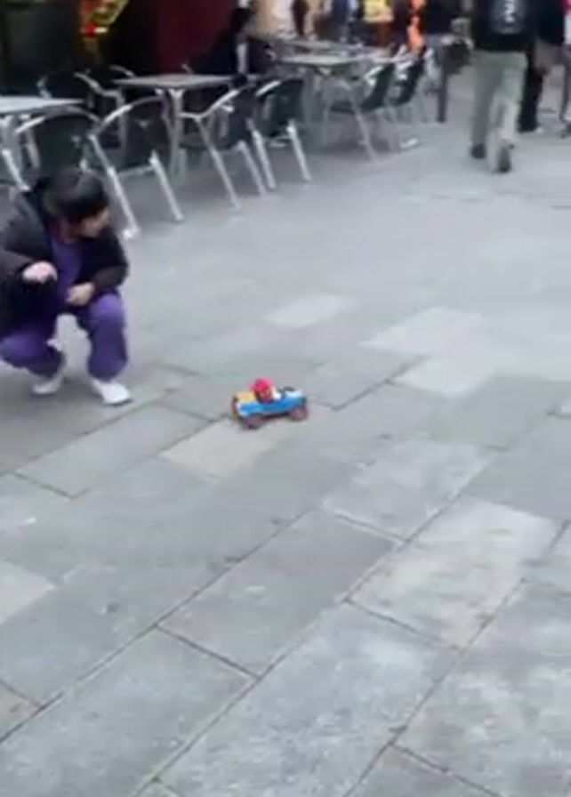 Children are playing with a small toy car on a sidewalk. The sidewalk is paved with rectangular gray stones. In the background are tables and chairs, buildings, and other pedestrians. Initially, two children are crouching near the toy car. A child in a purple jumpsuit kneels, while a child in a black jacket squats. The toy car, blue with a red figure on top, moves forward. Another child wearing a red jacket runs to join in. The children cheer and run after the car. The camera moves to follow the children. Shop signs are visible in the background. The children are laughing and excited.