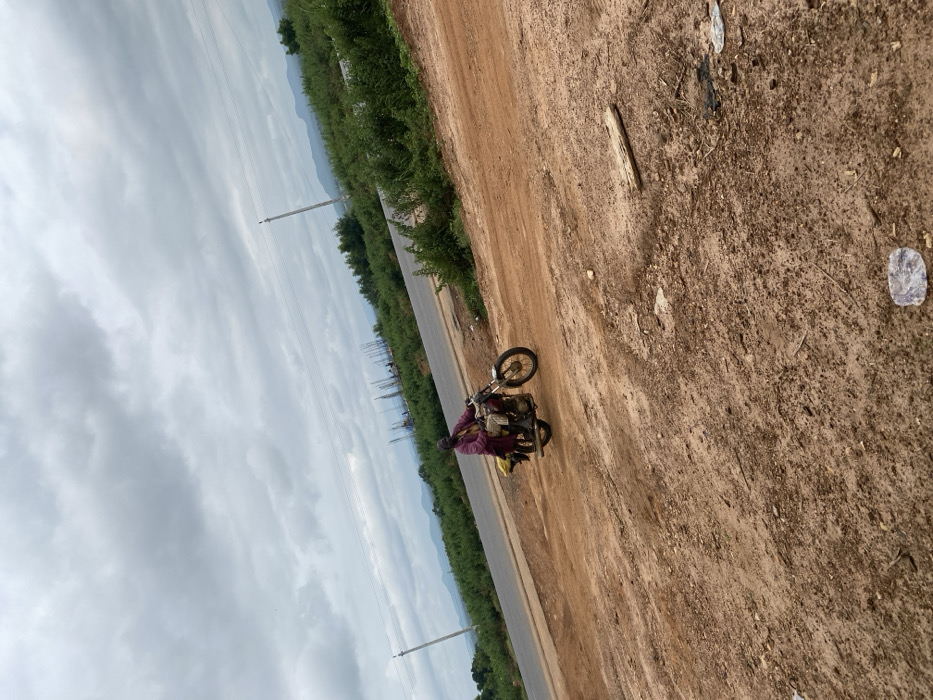 The scene depicts an outdoor environment on the outskirts of Abobo, Nigeria, under an overcast sky. A dark-paved road with a lighter shoulder traverses the mid-ground diagonally from the lower-left to the upper-right. The foreground consists of reddish-brown, unpaved earth containing scattered debris, including a segment of wood, dark amorphous plastic, and two crumpled translucent plastic items. A sole individual, appearing male and dressed in a maroon long-sleeved garment, operates a dark-framed motorcycle with chrome elements. The motorcycle is in motion, heading from left to right across the frame, positioned on the unpaved terrain adjacent to the paved road. Two containers are secured between the rider's legs on the motorcycle's frame, and a yellow object is affixed to the rear fender. Beyond the paved road, dense green vegetation populates the landscape. In the far background, distant mountains or hills are visible, partially obscured by atmospheric haze. Multiple utility poles are present in the mid-ground, extending towards the horizon. A line of construction cranes or industrial structures is silhouetted against the sky on the distant horizon, rising above the vegetation.