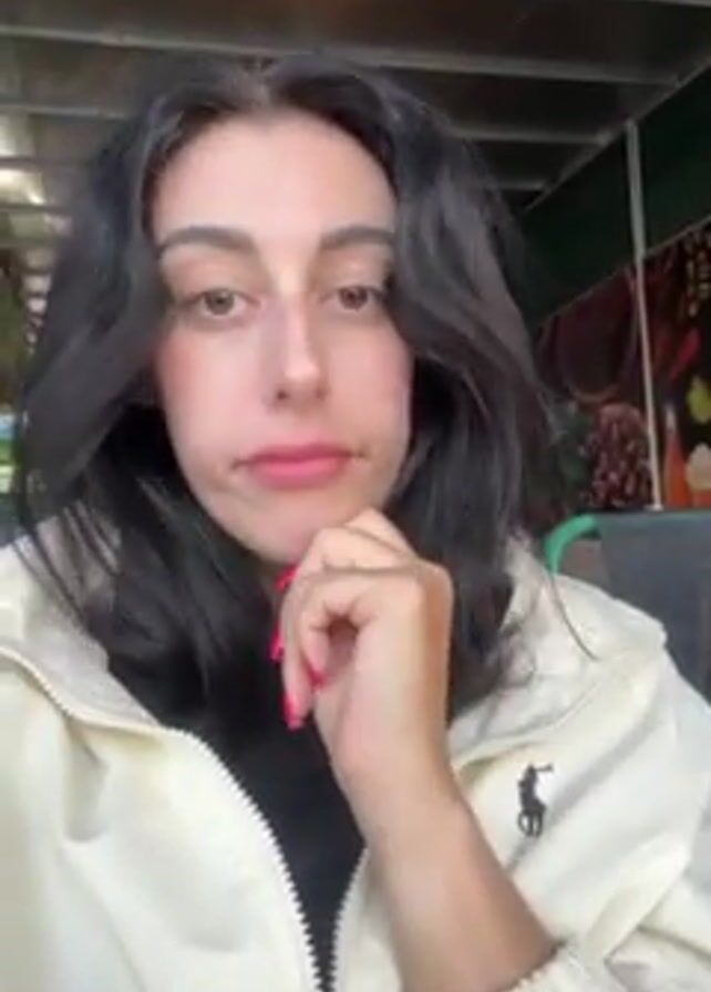 A woman with dark hair and a light-colored jacket is filming herself in what appears to be an outdoor cafe or restaurant