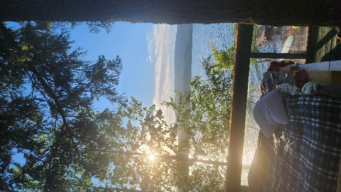 The image displays an outdoor scene at either sunrise or sunset, viewed from an elevated, rustic structure overlooking a large body of water in the city of Harrison, United States. The foreground features a sleeping platform constructed from light-colored wood, covered by a dark, plaid blanket and supporting a light-colored, crumpled pillow. Additional bundled fabric items are situated next to the pillow. A horizontal wooden beam spans the upper portion of this sleeping area. Below and to the right of the platform, a partial view of the rippled water is visible through a translucent barrier or window, along with a wooden dock or pier extending into the water. The midground is dominated by an expansive body of water, reflecting sunlight, with a distant, hazy shoreline composed of forested hills or mountains. Multiple green-leafed trees partially frame the view, with a prominent tree on the left heavily backlit by the sun, which appears low on the horizon and generates a significant sunburst effect. The background reveals a clear blue sky with scattered, wispy white clouds. The top portion of the image is filled with the dark silhouettes of dense tree canopies, and a large tree trunk occupies the far right side of the frame. No individuals are present in the scene.