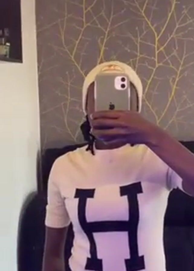 A person wearing a white T-shirt with a large black letter "H" and a white beanie is taking a mirror selfie with a smartphone