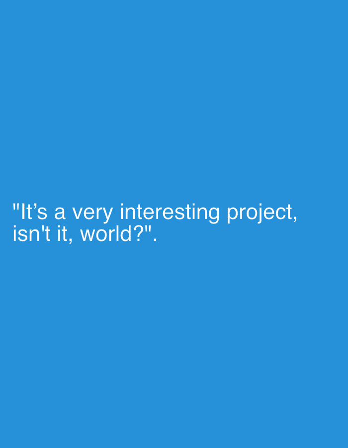The image displays white text against a solid, uniform blue background. The text, positioned in the lower-left quadrant of the frame, reads: "It's a very interesting project, isn't it, world?". No identifiable geographic location, including the city of Balykchi, Uzbekistan, is depicted. No individuals, specific objects beyond the text, or actions are visible within the scene.