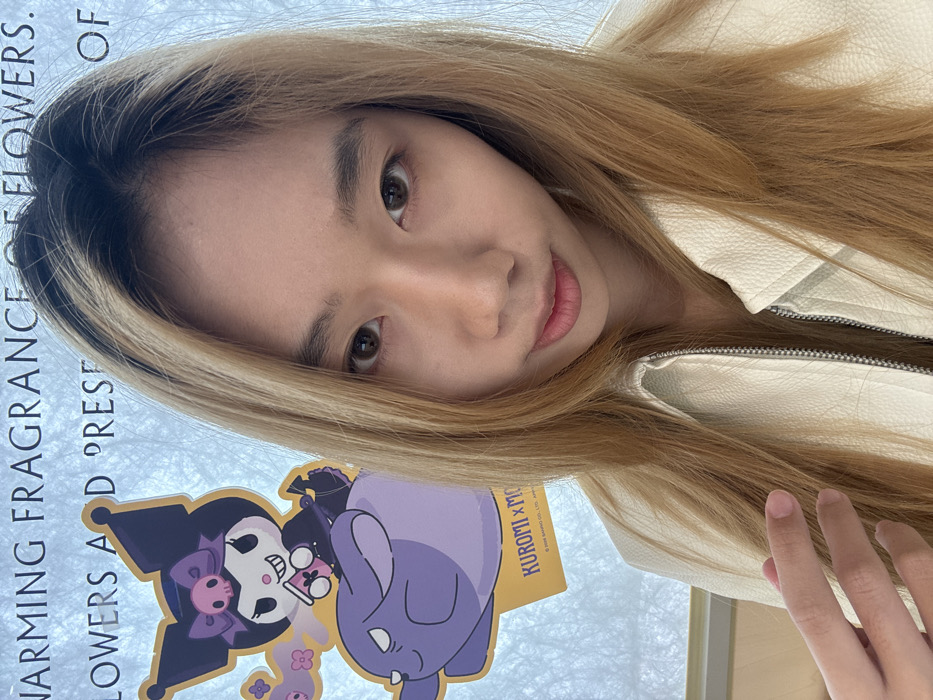 A single individual, an East Asian female, is depicted in a close-up, front-facing photograph. She possesses long, light brown hair with visible darker roots and wears a light-colored, textured jacket with a partially visible zipper. Her right hand is visible in the lower-left portion of the frame, with fingers slightly splayed. She maintains a neutral expression and looks directly at the camera. Positioned behind the individual is a two-dimensional promotional cutout featuring the Sanrio character Kuromi, a black and purple figure with a skull, riding on a large purple elephant-like creature identified as Baku. Text on this display reads "KUROMI x MO" and "© 2005 SANRIO CO., LTD. ALL RIGHTS RESERVED." In the background, white text is visible on a translucent surface, stating "WARMING FRAGRANCE OF FLOWERS." and "FLOWERS AND PRES." The environment suggests an indoor commercial or event space, possibly a retail establishment or exhibition area. The specific location within Longta, China, is not identifiable from the image content.