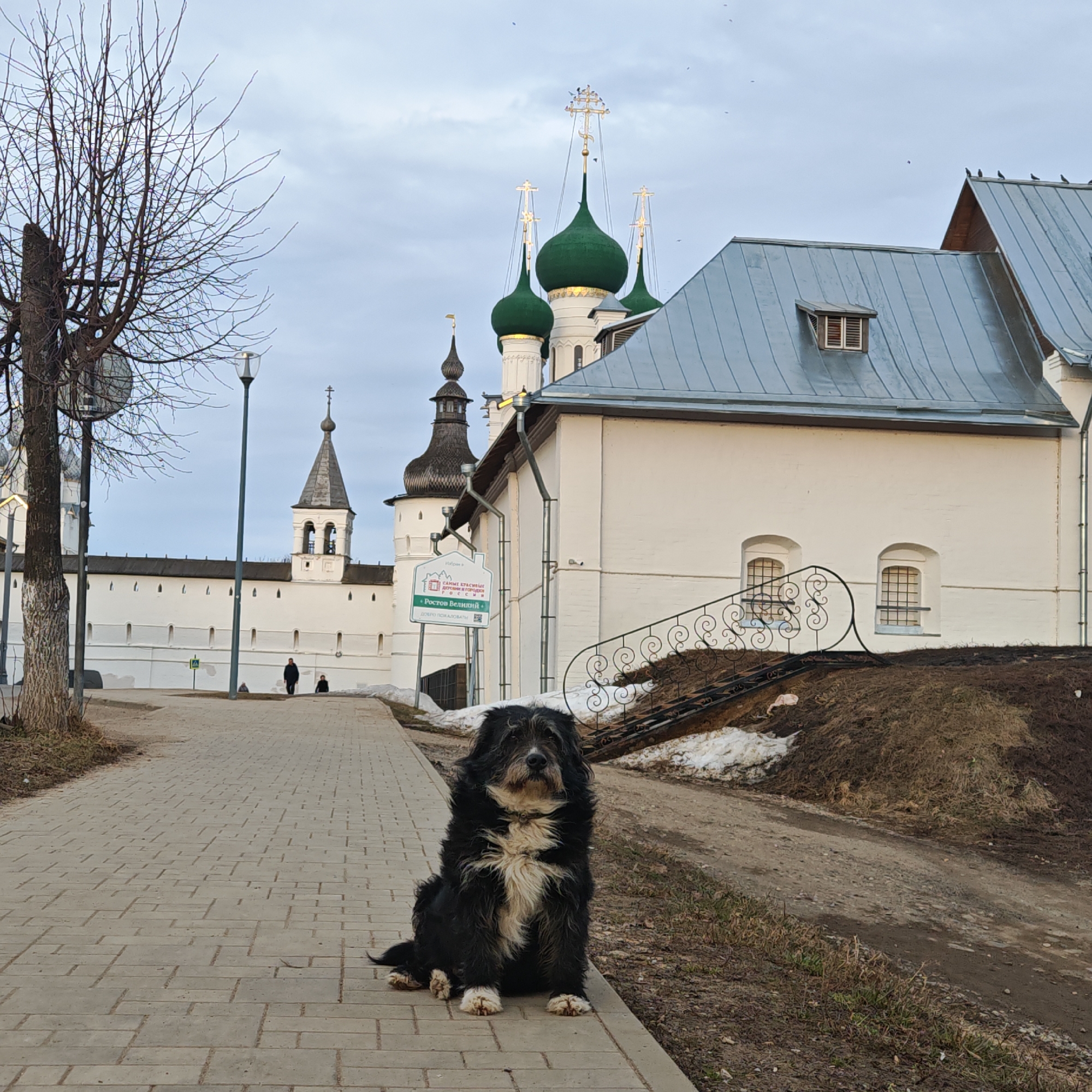 The image depicts an outdoor urban landscape during daytime under an overcast sky, located in Ново-Никольское, Russia. The background features a large architectural complex, identified by a prominent sign as 'Ростов Великий' (Rostov Veliky). In the immediate foreground, a medium-to-large-sized dog with shaggy black and white fur sits upright on a light-colored paved pathway, facing the viewer. The dog has a white chest, muzzle, and paws, and wears a collar. The paved path, made of rectangular blocks, extends diagonally into the mid-ground. To the right of the path, a dirt slope with patches of dried brown vegetation and melting snow is visible, featuring a decorative black wrought-iron railing ascending uphill. On the far left, a leafless tree trunk with bare branches rises. The mid-ground is dominated by a tall, white plastered fortified wall with a dark upper section and a series of small, arched openings. Beyond the wall, a complex of traditional Russian Orthodox buildings is visible. These include multiple white structures with green onion domes topped with golden Orthodox crosses. Several small birds are perched on the largest central cross, and others are scattered across the grey, overcast sky. Conical dark-roofed towers with spires are also part of the complex. A section of a grey corrugated metal roof with a small dormer window is visible on the right, with several dark birds perched along its ridge. A tall, slender grey street lamp stands on the left side of the paved path. A white rectangular sign, bearing green and red Cyrillic text including "Ростов Великий", is mounted on a pole near the fortified wall. Two distant human figures are observed walking on the paved pathway in the far background, moving away from the viewer towards the left, with a third smaller figure partially visible further left.