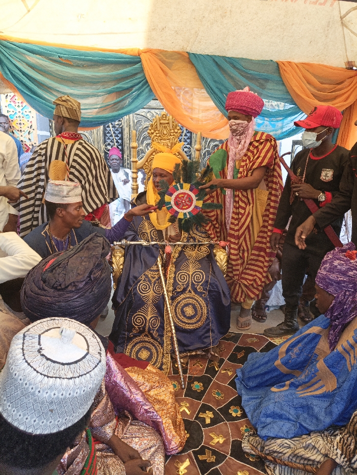 The image depicts an indoor ceremonial gathering within Gwagwarwa, Nigeria