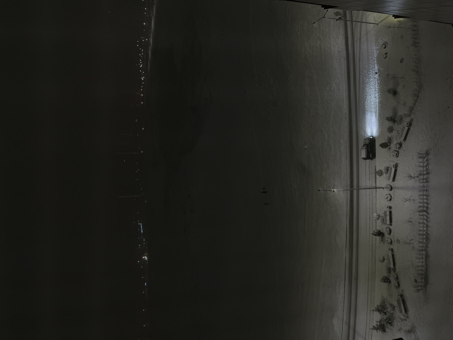 A nighttime aerial view shows a street covered in snow with a car parked beside a row of benches and trees. Streetlights illuminate the scene. To the left of the street is a dark expanse with a faint line of lights, possibly a distant shoreline. The overall tone is cold and desolate.