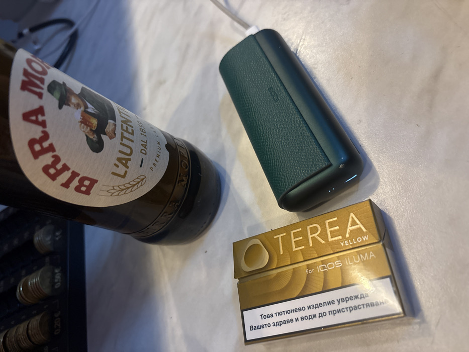 The scene depicts a light-colored, possibly marble-patterned countertop, characteristic of a retail point-of-sale in Sofia, Bulgaria. In the foreground, a dark green IQOS Iluma device lies horizontally, connected by a white charging cable to its right side, with three illuminated white indicator lights on its left edge. To the left of the device, a golden-yellow pack of TEREA for IQOS ILUMA YELLOW heated tobacco sticks is positioned, displaying a Bulgarian health warning on its side. Above these items, a brown glass bottle of Birra Moretti L'AUTENTICA beer stands upright, its label featuring a man drinking from a mug and stating "DAL 1859 PREMIUM LAGER." In the upper left background, a black plastic coin tray is partially visible, containing various Euro coins, including 0.20 EUR, 0.50 EUR, and 1 EUR denominations, indicating a commercial establishment.