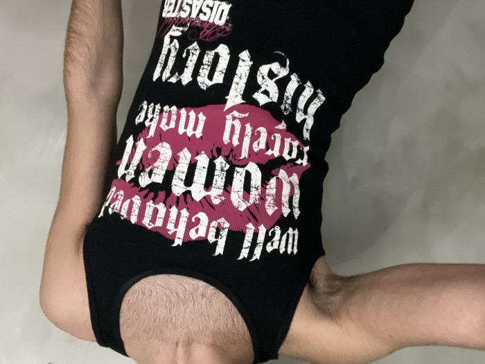 This image depicts a close-up of an individual standing indoors in the city of Torrent, Spain, against a plain, light gray wall. The person, likely male based on visible body hair, is wearing a black ribbed tank top. The tank top features prominent white, distressed text. The main phrase reads "well behaved women rarely make history," with the word "women" rendered in a larger, stylized white font superimposed over a pink/magenta lip graphic. Below "history," additional smaller white text, identified as "DISASTER," is partially visible. The individual exhibits visible chest hair above the tank top's neckline, as well as hair on both underarms and forearms. Their left arm is extended outwards from the body. No specific actions beyond posing are observable, and no interactions with other individuals or objects are present within the frame.